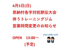 4/5(日) 恩納村駅伝大会に伴うトレーニングジム営業時間変更について