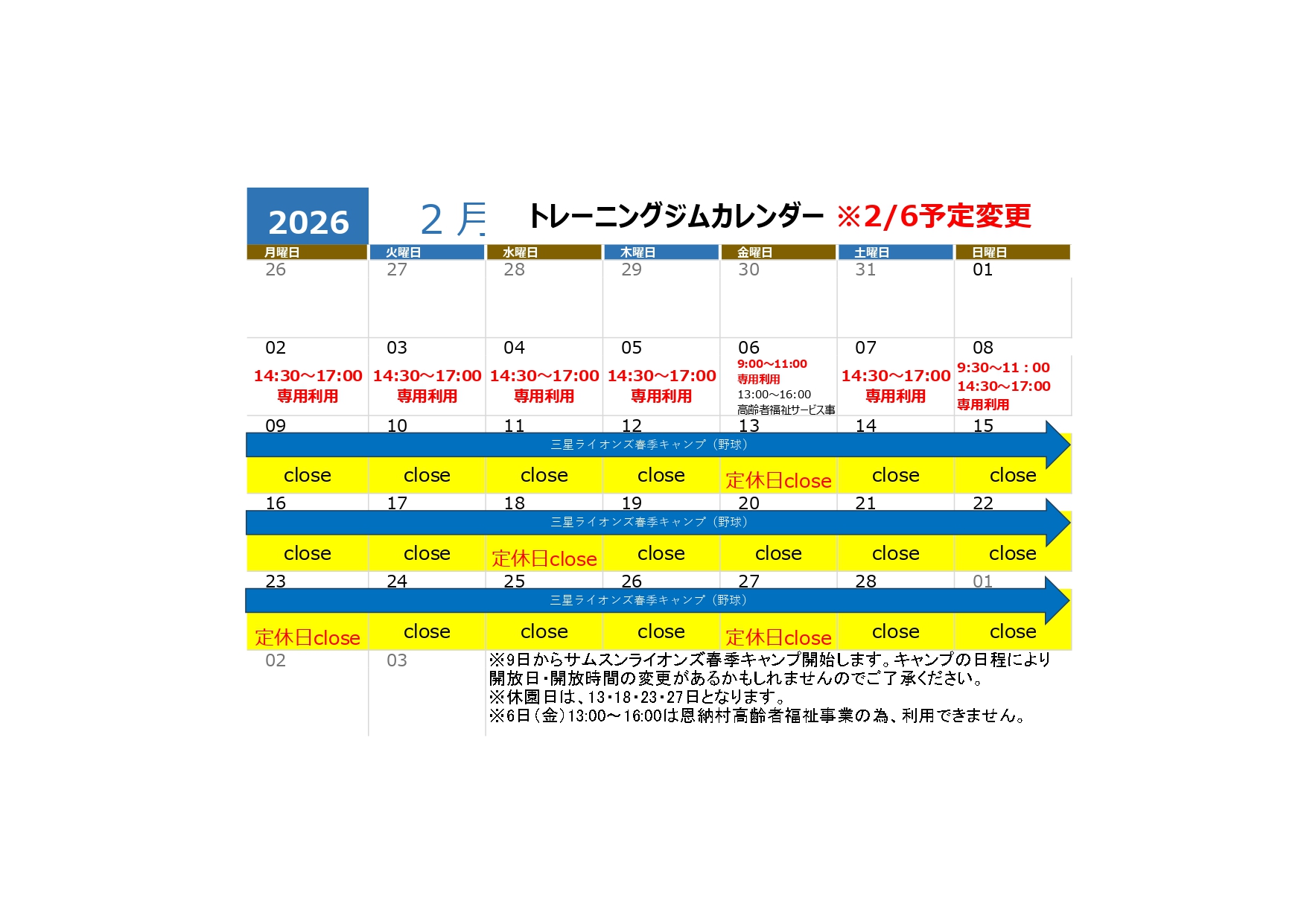 2月のトレーニングジムのスケジュールに変更がありましたのでお知らせします。